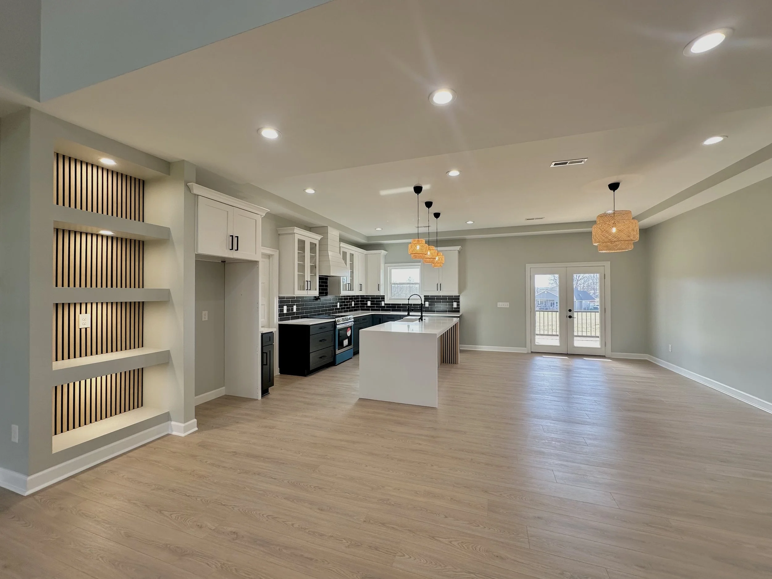 Open-concept living space with kitchen, island, and dining area. Light wood flooring, white cabinetry, black backsplash, and ceiling lights. French doors lead outside.