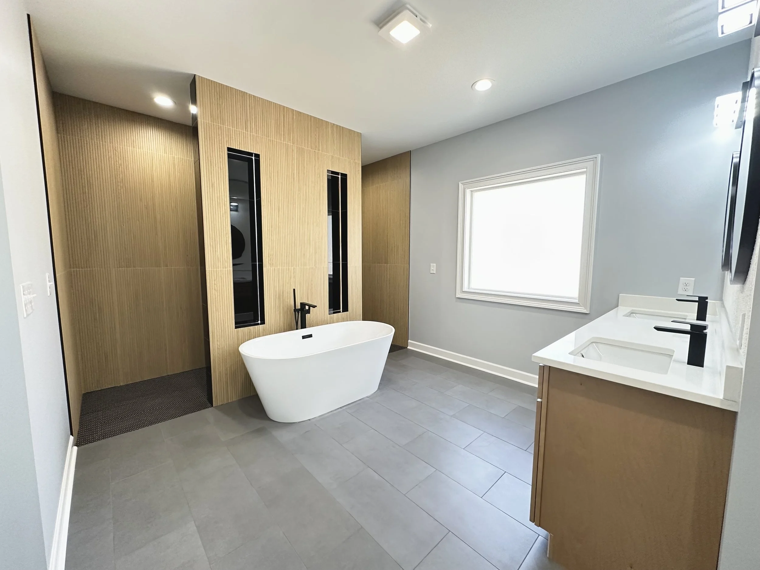 Modern bathroom with a freestanding bathtub, double vanity sinks with black fixtures, a window with white trim, and a wooden accent wall with black vertical design elements.